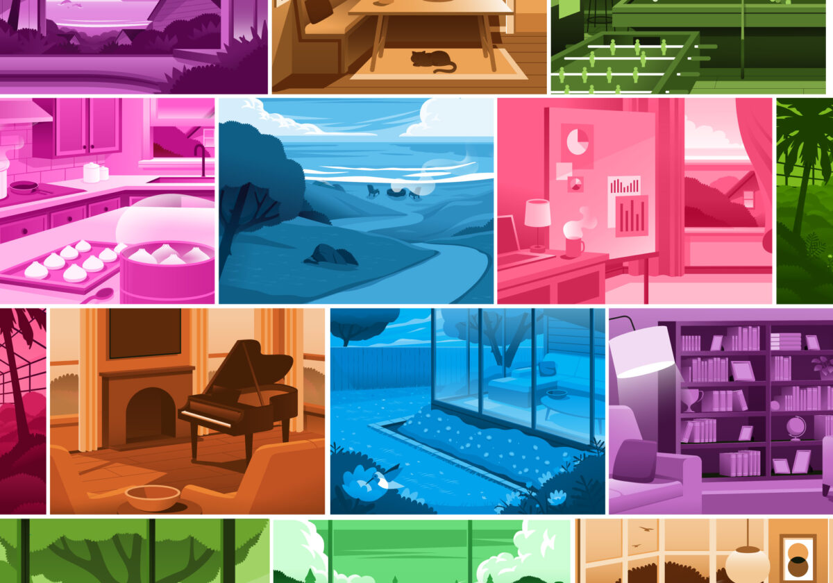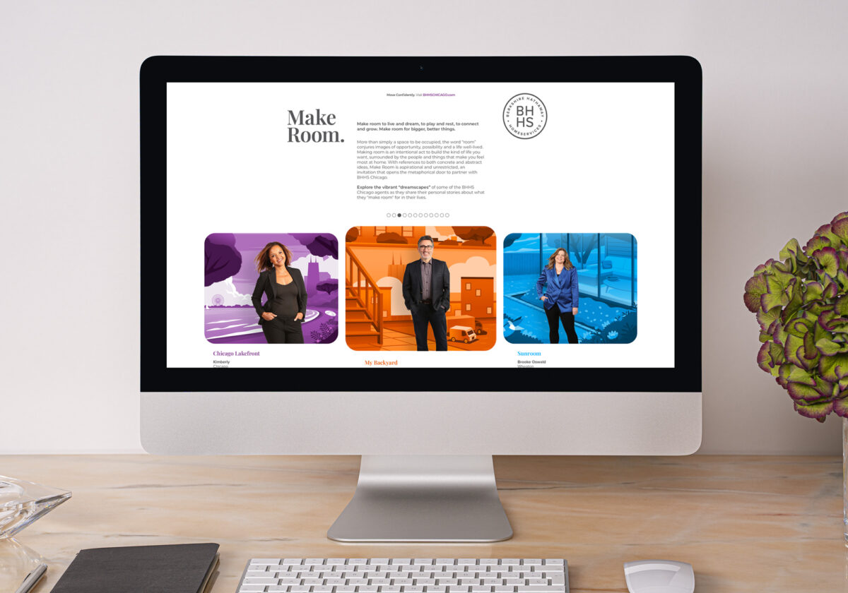The campaign showcases a group of 12 agents and managing brokers who are situated in bright, monochromatic interior scenes, created as distinctive and alluring digital renderings, that represent their favorite space at home. They have been photographed in-studio and digitally placed into these vibrant vignettes to maintain a kind of “otherworldliness.” To reinforce the visual settings, we have captured the participants’ personal narratives that illuminate why that room matters most to them, using them as written stories that appear in detailed narratives on the campaign microsite.